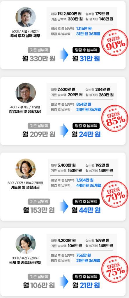 18년간 개인사업을 운영하다 코로나 이후 재정이 어려워졌고, 월 변제금과 이자만 250만원이 나가 매일 불안했습니다.